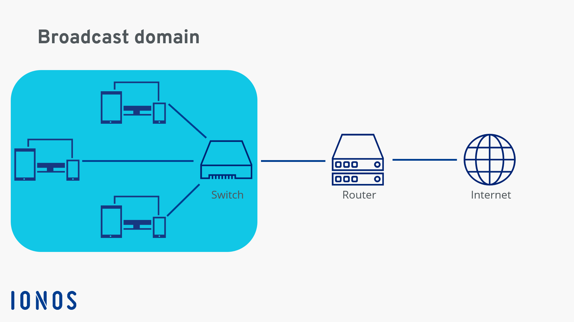 Alle noder, der er forbundet via switche og repeatere, er normalt en del af det samme broadcast-domæne. Domænet afsluttes dog ved en router, da denne netværksenhed fungerer på netværkslaget (Layer 3). Derfor er computere, der forbinder sig med hinanden via internettet, ikke en del af det samme broadcast-domæne.
