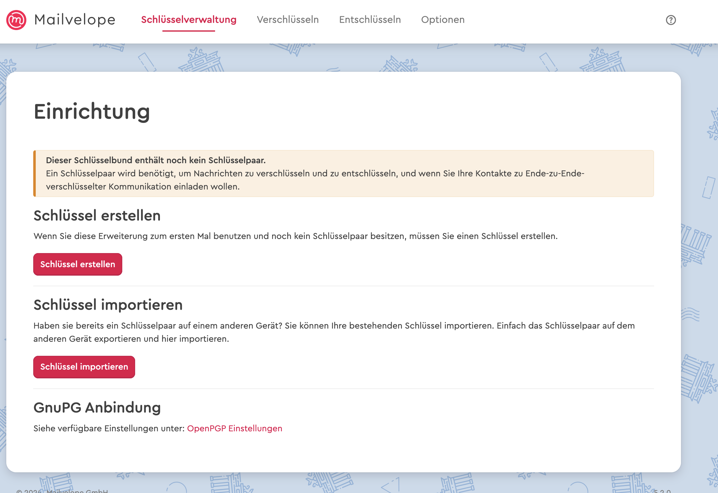 Wer bevorzugt über Webmail-Dienste wie Gmail, Yahoo, GMX, Web.de oder Outlook.com kommuniziert, macht mit der Browser-Erweiterung Mailvelope alles richtig. Das Add-on basiert auf OpenPGP.js, und ist für Google Chrome, Microsoft Edge und Mozilla Firefox verfügbar. Sobald Sie die Erweiterung installiert haben, erscheint in der Symbolleiste Ihres Browsers das Mailvelope-Icon, über das Sie die Nutzeroberfläche aufrufen können. Hier erstellen, importieren und verwalten Sie Ihre Schlüssel sowie die öffentlichen Schlüssel Ihrer Gesprächspartner oder laden erstellte Public Keys auf einen öffentlichen Schlüssel-Server hoch.