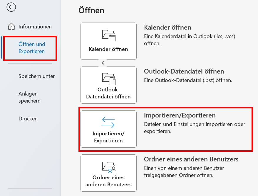 Um Ihren Google-Kalender über die Outlook-Desktop-App zu importieren, starten Sie diese im ersten Schritt. Rufen Sie den Reiter „DATEI“ auf und wählen Sie den Punkt „Öffnen und exportieren“ aus. Klicken Sie auf „Importieren/Exportieren“, um den Assistenten für den Import und Export von Dateien und Einstellungen zu öffnen.