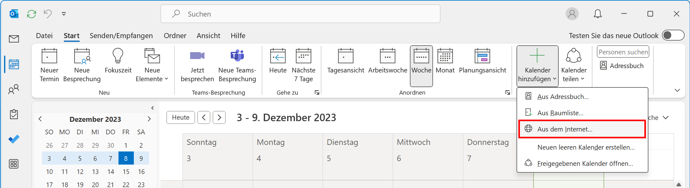 - Ändern Sie die Outlook-Ansicht zur Kalender-Ansicht und klicken Sie unter dem Reiter „Start“ auf „Kalender hinzufügen“ > „Aus dem Internet“.