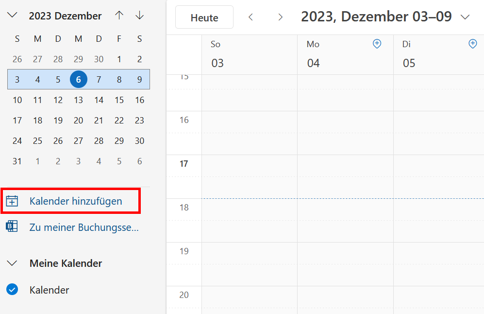 Das Abonnieren des Google-Kalenders mit der Outlook-Web-App funktioniert im Grunde sehr ähnlich wie bei der Desktop-App: Zunächst müssen Sie natürlich auch in diesem Fall die notwendige iCal-Adresse des Google-Kalenders in Erfahrung bringen, bevor Sie sich in ihrem Outlook-Konto anmelden. Dort wechseln Sie wie beim Desktop-Client in die Kalenderansicht und klicken auf „Kalender hinzufügen“.