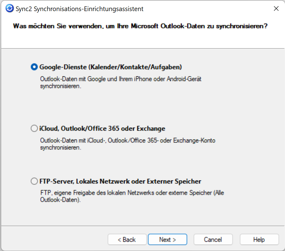 Schritt 2: Installieren und starten Sie das Programm auf Ihrem PC. Der Synchronisations-Einrichtungsassistent offeriert Ihnen anschließend verschiedene Optionen – je nachdem welche Konten Sie synchronisieren möchten. Für die Verknüpfung von Outlook- und Google-Kalender wählen Sie die Option „Google-Dienste“.