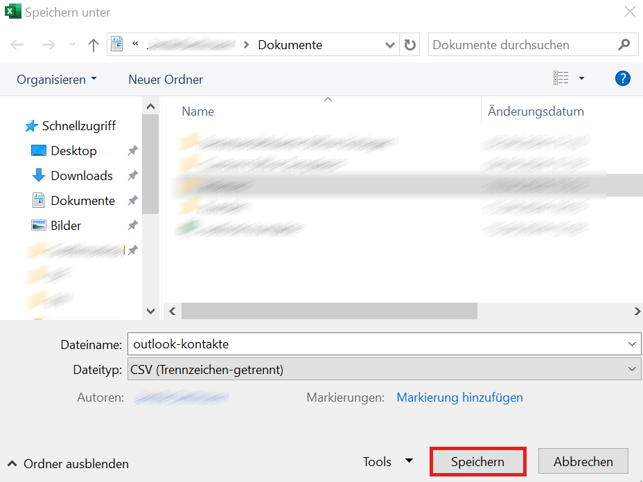 - Suchen Sie den Eintrag „CSV (Trennzeichen-getrennt)“ und wählen Sie diesen aus. Drücken Sie zum Abschluss auf „Speichern“. Sie erhalten von Excel den Hinweis, dass einige Features der Arbeitsmappe verloren gehen (Folge des Umstiegs auf das CSV-Format), was Sie durch „OK“ akzeptieren.