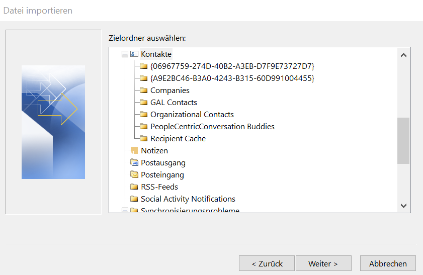 - Zielordner „Kontakte“ anklicken -> „Weiter“ -> „Fertig stellen“