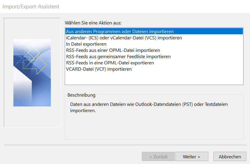 - Im Import/Export-Assistenten „Aus anderen Programmen oder Dateien importieren“ auswählen -> „Weiter“
