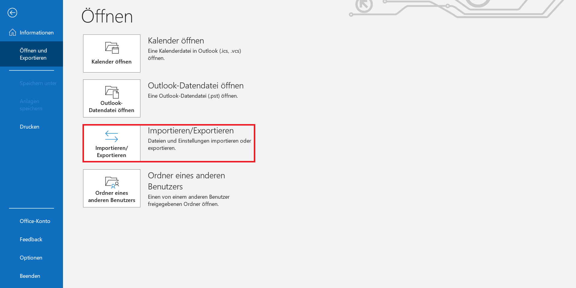 In der linken Menüleiste navigieren Sie nun zu „Öffnen und exportieren“, wo Sie den Assistenten per Klick auf „Importieren/Exportieren“ starten.