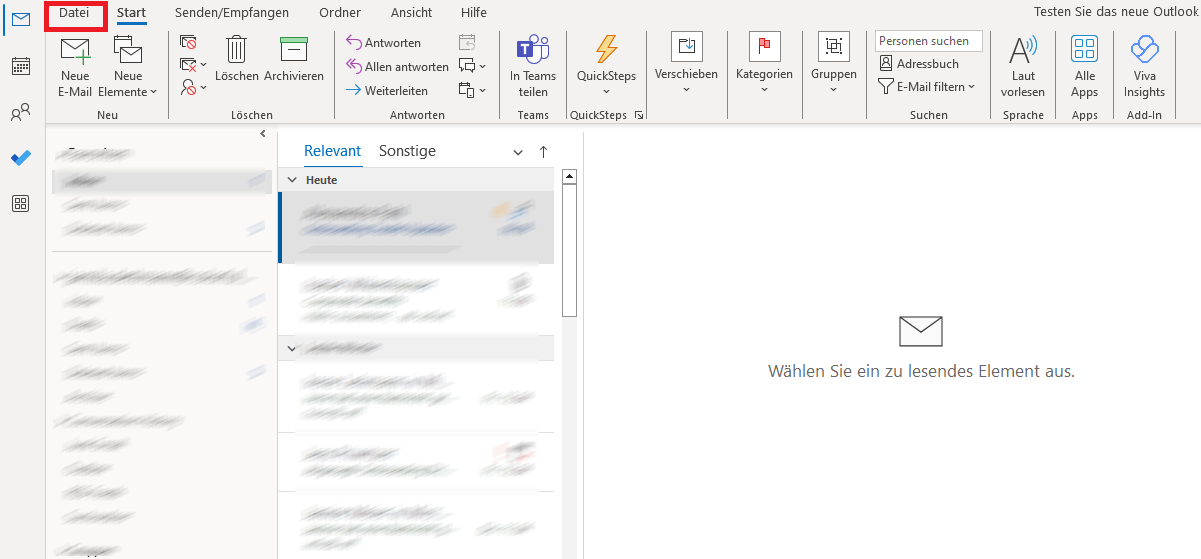 Nutzende neuerer Outlook-Versionen finden den Import/Export-Assistenten im Menü „Datei“. Dieses öffnen Sie im ersten Schritt über die gleichnamige Registerkarte: