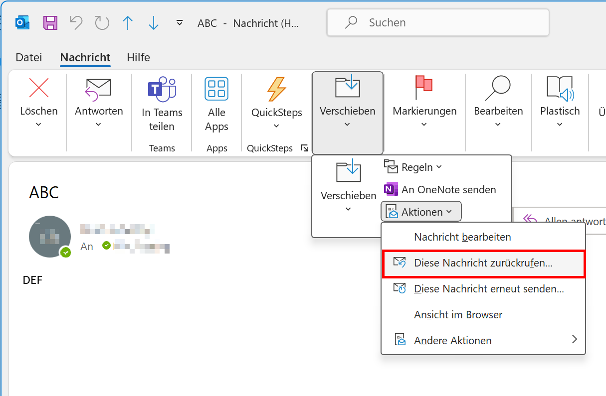 - Klicken Sie auf „Aktionen > Diese Nachricht zurückrufen…“
