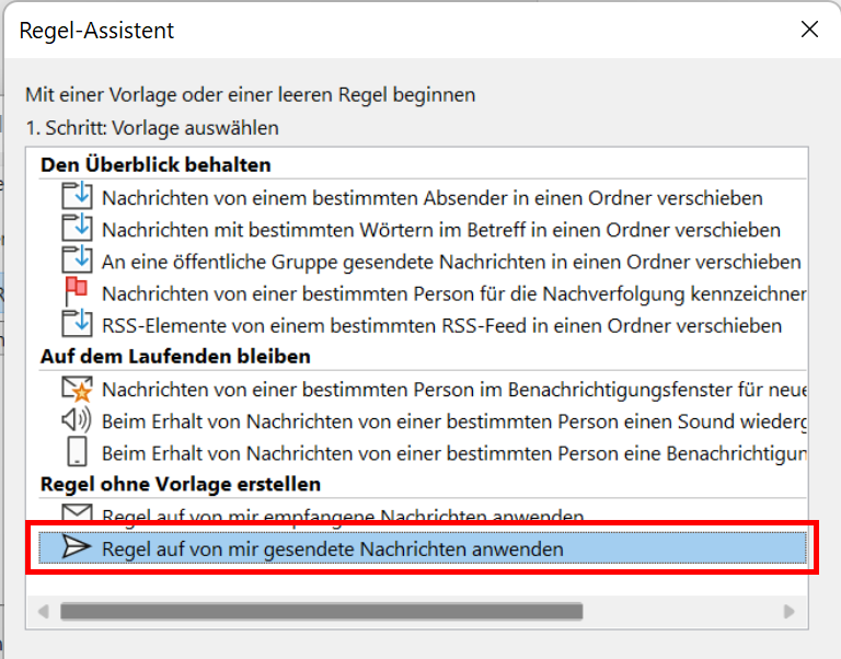 - Selektieren Sie die Option „Regel auf von mir gesendete Nachrichten anwenden“ und klicken Sie auf „Weiter“.
