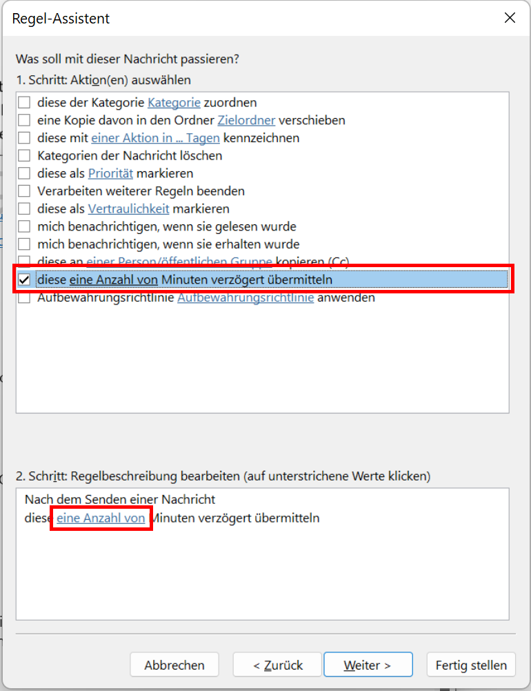 - Setzen Sie im nächsten Dialog neben der Option „diese eine Anzahl von Minuten verzögert übermitteln“ ein Häkchen. Klicken Sie im zweiten Feld unten auf „eine Anzahl von“, um Ihre gewünschte Zeitspanne festzulegen.
