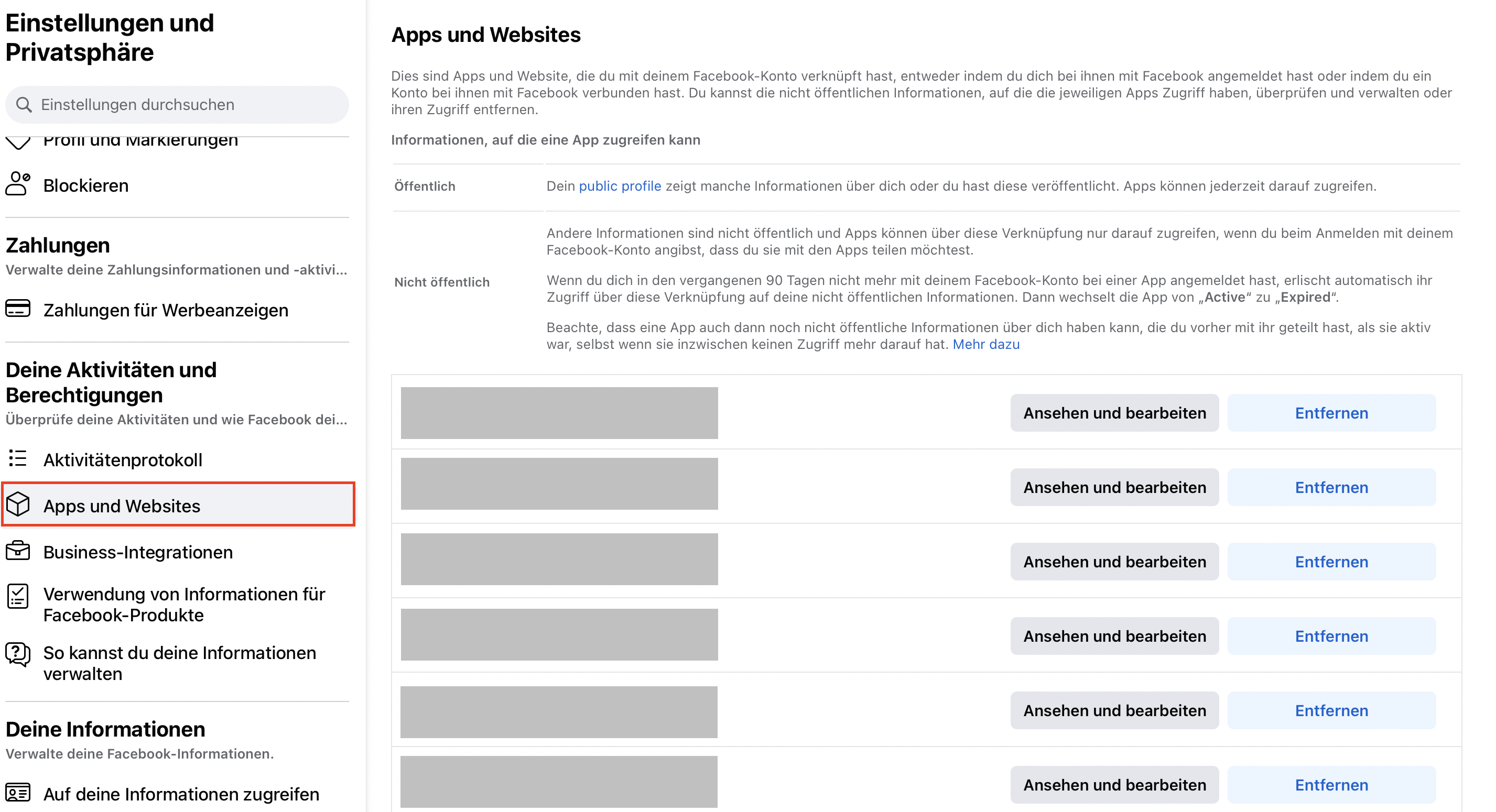 Viele wissen, dass Facebook sich die Rechte an allen Inhalten vorbehält. Man hat auch vage davon gehört, dass Facebook Profildaten und Freundeslisten an Werbetreibende verkauft. Aber wie weit spannt sich dieses Netz? Welche Apps, die man auf Facebook nutzt oder bei denen man sich mit Facebook anmeldet, haben Zugriff auf welche Daten? Bevor Sie Ihren Facebook-Account löschen, lohnt sich ein Blick in die Facebook-App-Einstellungen. Klicken Sie dafür auf Ihr Profilbild und wählen Sie den Punkt „Einstellungen und Privatsphäre“ > „Einstellungen“ aus dem Drop-down-Menü. Scrollen Sie anschließend in der linken Seitenleiste zum Punkt „Apps und Websites“.