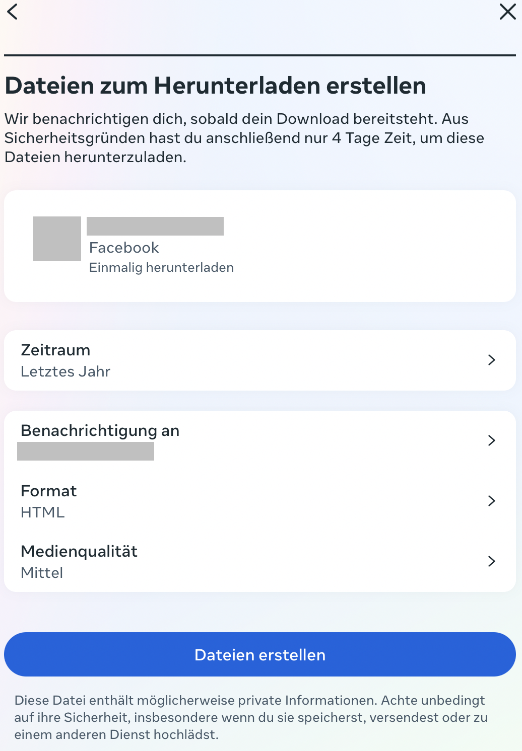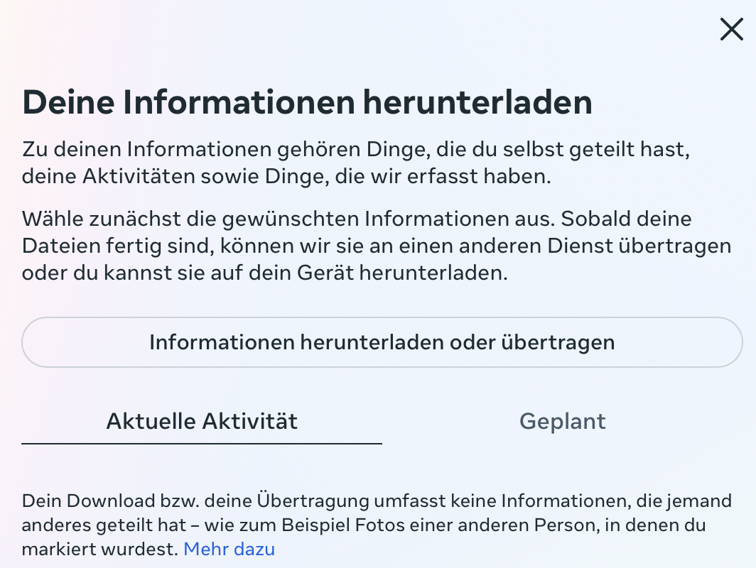 Natürlich wollen Sie nicht sämtliche Urlaubsfotos und Nachrichten verlieren, wenn Sie Ihren Account tilgen. Deshalb nutzen Sie am besten die Back-up-Funktion, um alle wichtigen Medien und Unterhaltungen auf Ihren Computer zu laden. Navigieren Sie dafür auf Ihr Profilbild und wählen Sie den Punkt „Einstellungen und Privatsphäre“ > „Einstellungen“ aus dem Drop-down-Menü. Über den Punkt „Deine Informationen herunterladen“ in der Seitenleiste gelangen Sie in die Kontenübersicht, wo Sie die gespeicherten Daten herunterladen können.