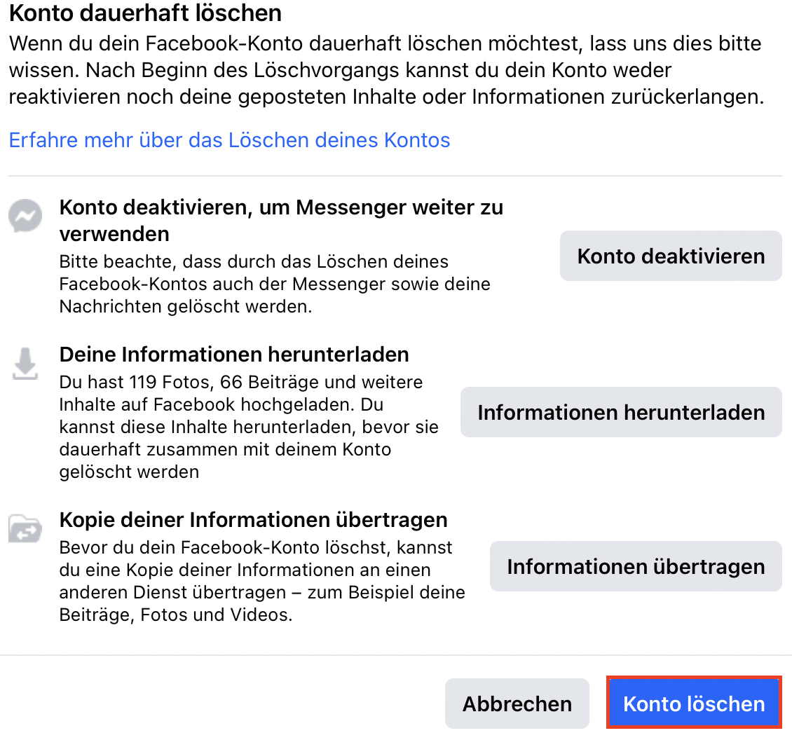 - Folgen Sie den Anweisungen und bestätigen Sie den Löschvorgang anschließend mit einem Klick auf den Button „Konto löschen“.
