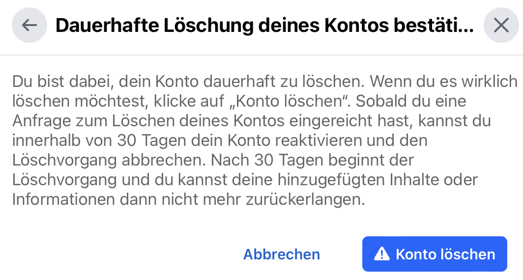 Ab jetzt sehen andere Facebook-Nutzende weder Ihr Profil noch Ihre auf Facebook hochgeladenen Medien. Innerhalb von 30 Tagen können Sie das Konto durch einen einfachen Login reaktivieren. Nach Ablauf der Übergangszeit beginnt die Tilgung Ihrer Daten und Dateien aus der Facebook-Datenbank. Bis alle Daten, die mit Ihrem Facebook-Account verbunden sind, gelöscht werden, können bis zu 90 Tage vergehen. Erst dann haben Sie Ihr Facebook-Konto für immer gelöscht.