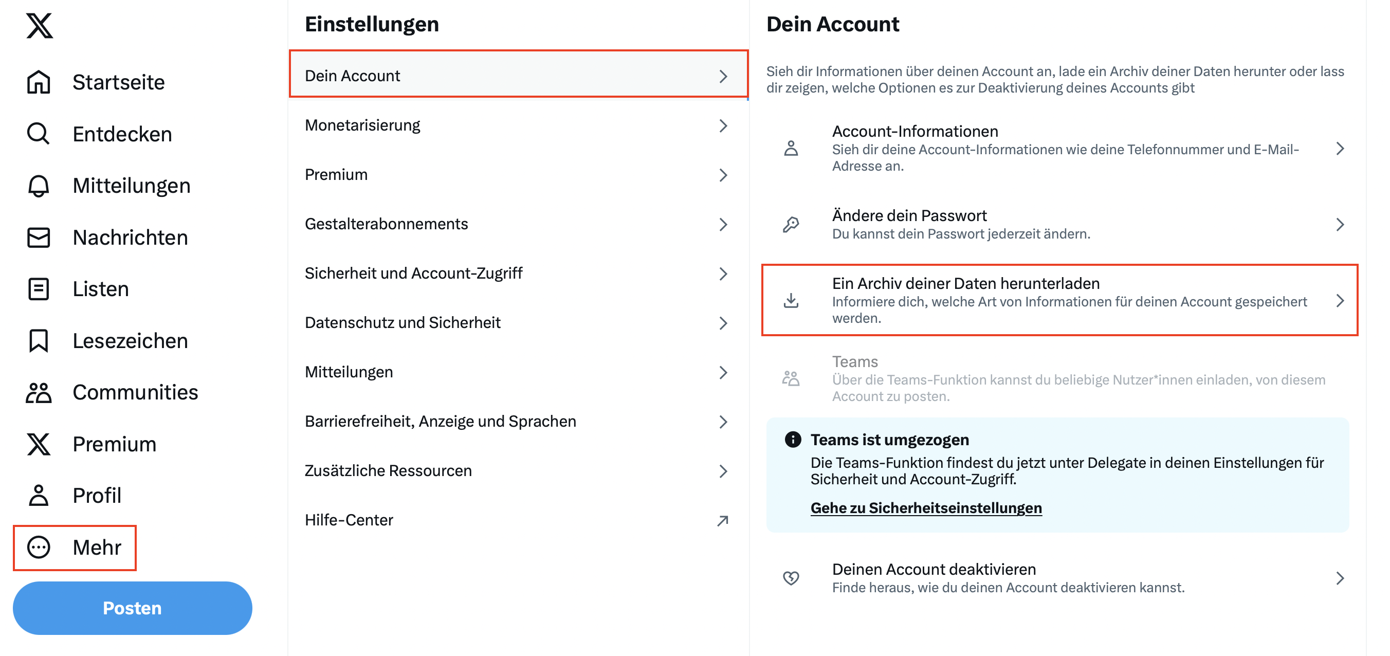 Sind Sie an der Archivierung interessiert, können Sie die Daten anfordern, indem Sie die Einstellungen Ihres Profils aufrufen und die entsprechende Schaltfläche unter „Dein Account“ -> „Ein Archiv Deiner Daten herunterladen“ drücken. Sie werden dazu aufgefordert, Ihr Passwort einzugeben. Anschließend erhalten Sie einen Verifizierungscode per Mail oder SMS: Bestätigen Sie mit diesem Ihre Identität. Dann können Sie Ihre Daten einfach herunterladen.