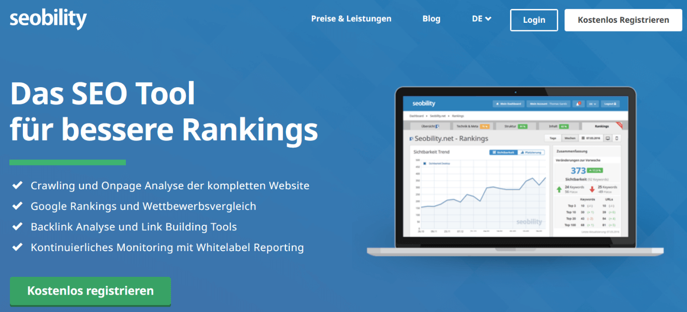 Mit Seobility nutzen Sie ein Tool, das ebenfalls viele Funktionen in sich vereint, aber etwas schlanker gestaltet ist. Vor allem in drei Bereichen unterstützt Sie das Werkzeug: