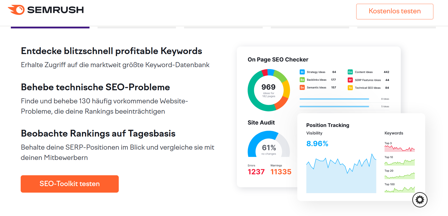 - Keyword-Recherche und -tracking: ausgiebige Wettbewerbsanalyse und Identifikation von Keyword-Potenzialen