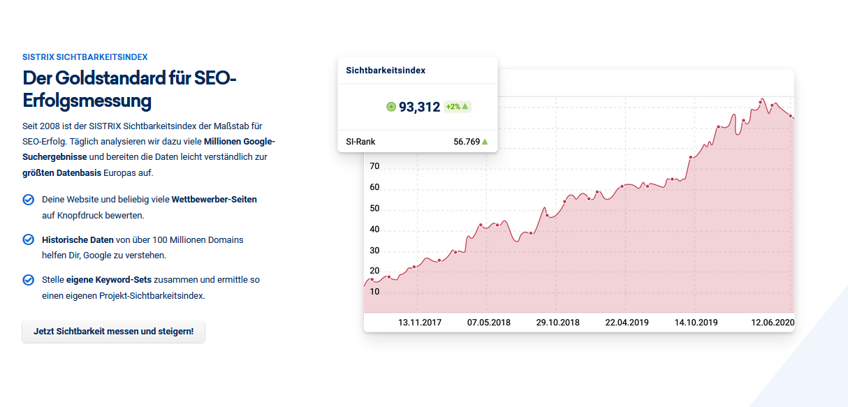 Die Plattform Sistrix ist für allem für ihren Sichtbarkeitsindex bekannt. Mit dem SEO Tool kann man aber noch mehr Aufgaben erledigen. Auf folgende Punkte legt Sistrix den Fokus:
