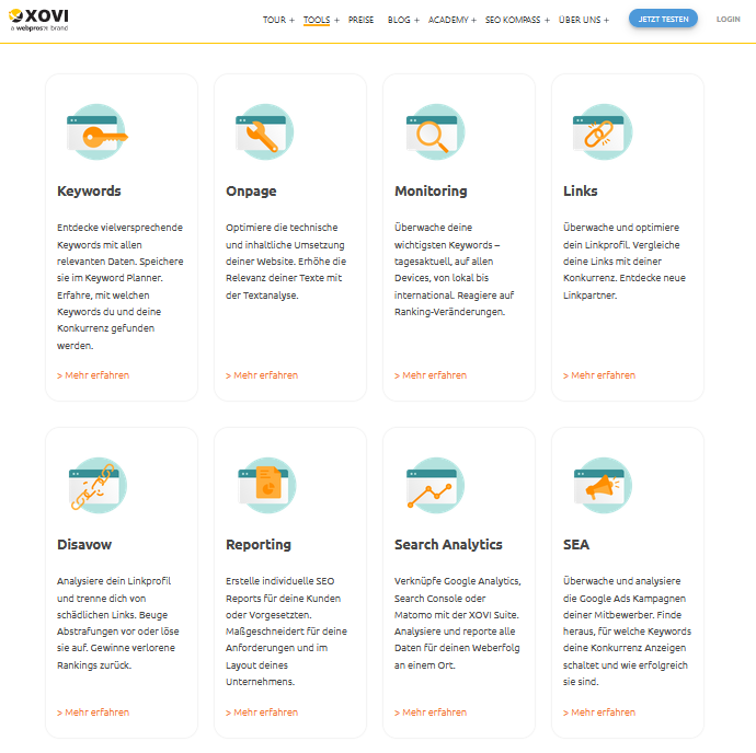 XOVI richtet sich sowohl an Webmaster als auch SEO-Profis. Dafür gibt es unterschiedliche Preisklassen, die sich vor allem in der Menge an überwachbaren URLs und der Anzahl der Nutzerkonten unterscheidet. XOVI bietet auch Lernmaterialien an und veranstaltet Seminare.