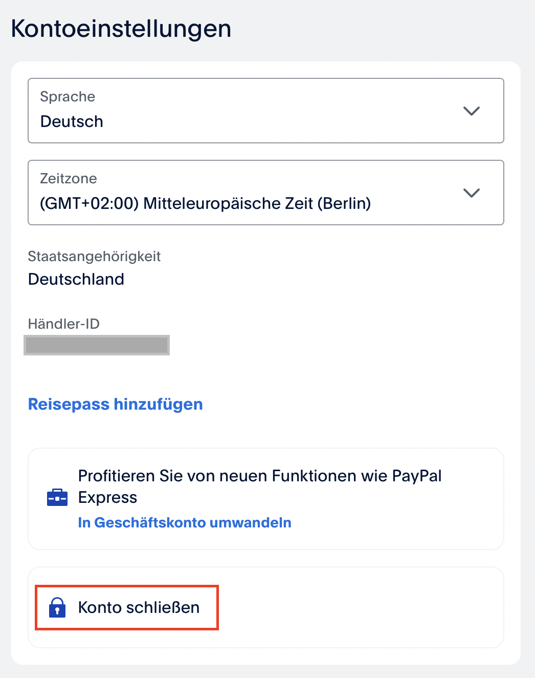Sie haben nun direkten Zugriff auf Ihre Kontoeinstellungen, in denen Sie unter anderem auch die Sprachversion des Profils ändern oder Ihre Händler-Nummer einsehen können. Die entscheidende Schaltfläche finden Sie aber ganz zum Schluss: Über „Konto schließen“ starten Sie den Vorgang zum Löschen Ihres PayPal-Kontos.