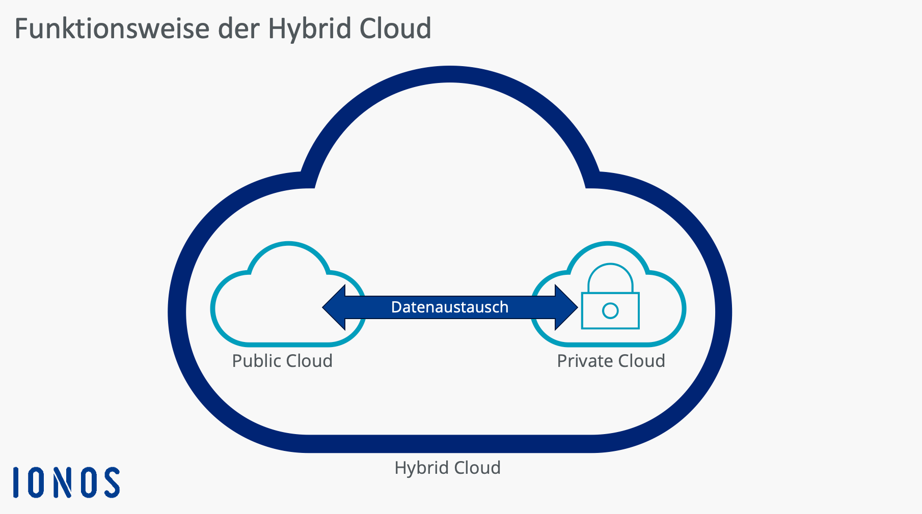 Im Kontext von Hybrid Clouds werden auch Rechenzentren vor Ort, die sogenannten On-Premise-Lösungen, als Private Cloud begriffen. Deshalb beschränkt man sich bei der Beschreibung von Hybrid Cloud auf die Definition: Mischform aus Private Cloud und Public Cloud.