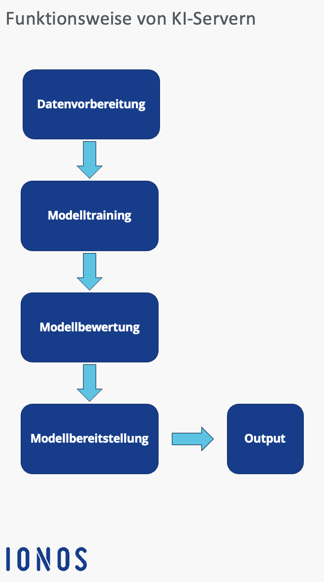 Ein AI-Server arbeitet, indem er große Mengen von Daten verarbeitet und analysiert. Ziel ist es, mithilfe von Machine Learning oder Deep Learning Modelle zu trainieren, die dann Vorhersagen treffen, Entscheidungen basierend auf neuen Daten treffen oder im Falle von generativer KI Output erstellen können. Die Arbeitsweise eines KI-Servers kann in mehrere Schritte unterteilt werden: