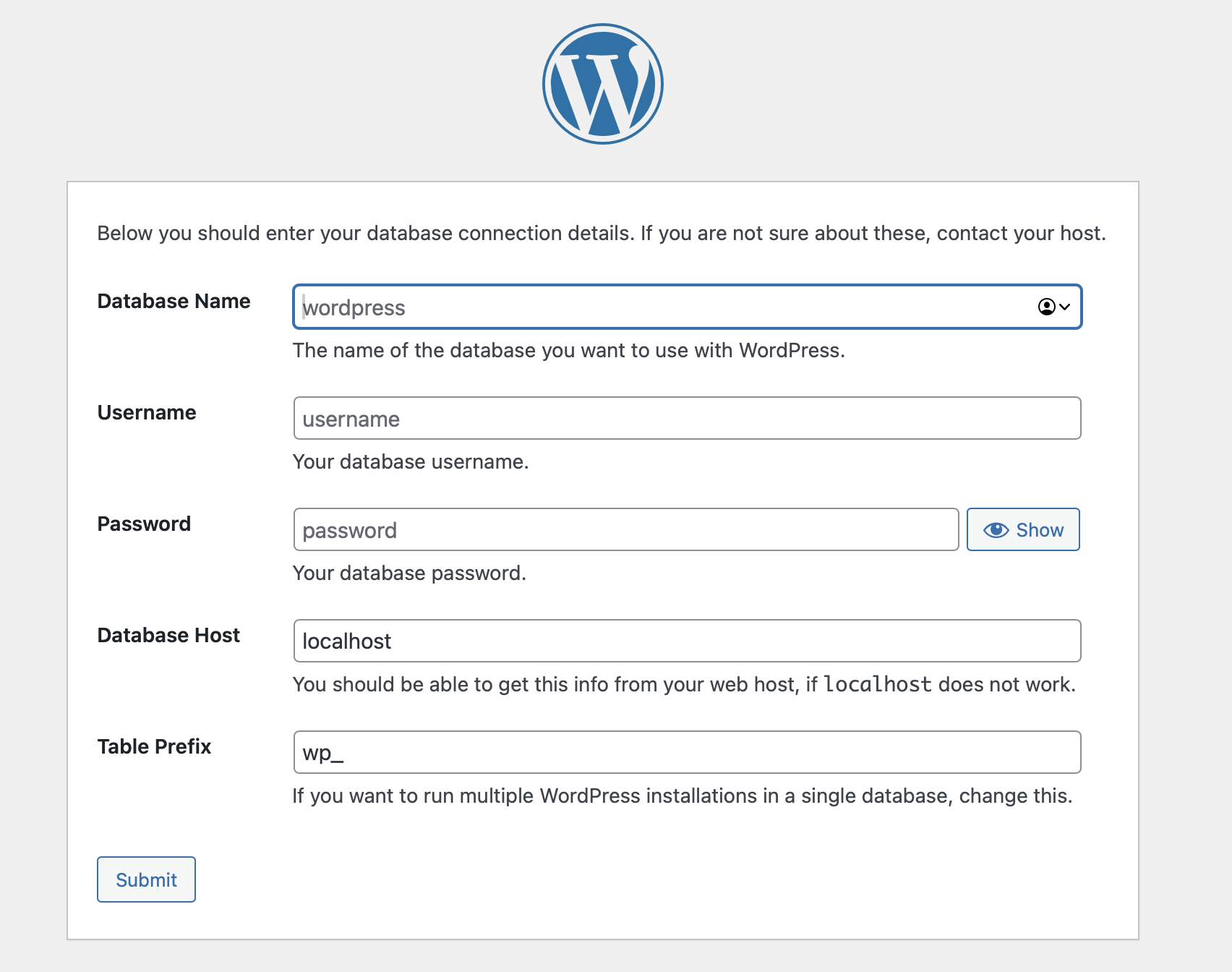 Beachten Sie, dass der Default-User, sofern nicht anders spezifiziert, „root“ ist, und geben Sie hier den Namen Ihrer erstellten Datenbank sowie das gewählte Passwort an. Ein Klick auf „Submit“ leitet Sie weiter durch den Installationsprozess.