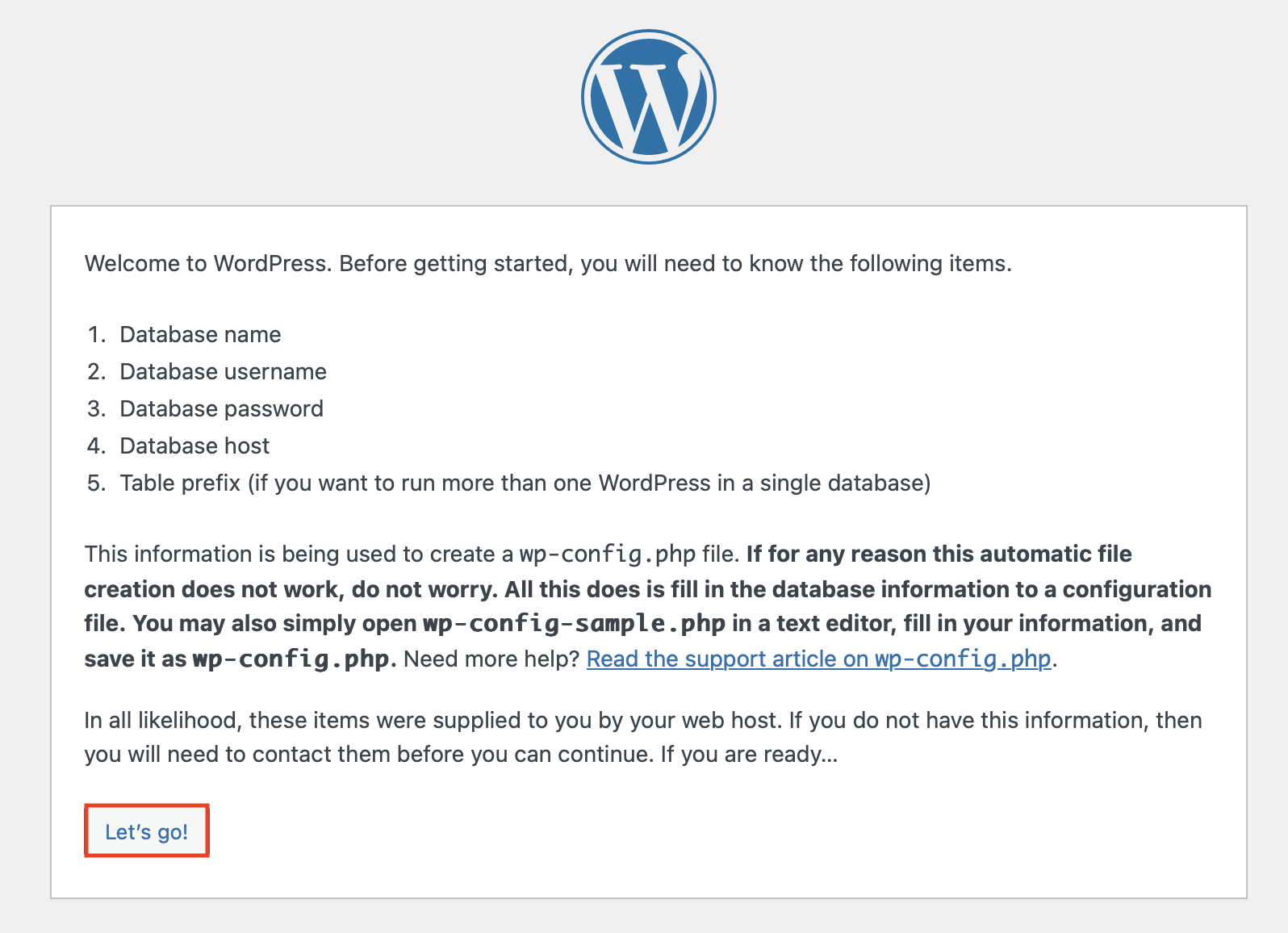 Auf der nächsten Seite erhalten Sie einen Hinweis, der Sie auf die weitere Installation vorbereitet. Klicken Sie auf die Schaltfläche „Let’s go!“, um fortzufahren.