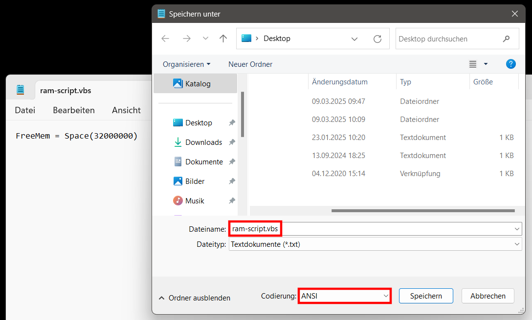 FreeMem = Space(32000000)txtSpeichern Sie die Datei unter dem gewünschten Namen. Achten Sie dabei darauf, dass ANSI als Codierungsform eingestellt ist, sofern der Editor eine entsprechende Option anbietet. Der letzte Schritt besteht darin, dass Sie die standardmäßige Endung .txt durch die Endung .vbs ersetzen. Nur auf diese Weise kann Windows feststellen, dass es sich bei der Datei um ein Skript handelt.