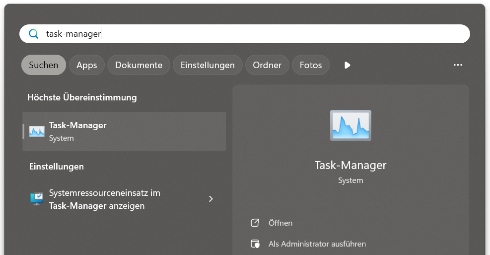 Der Task-Manager listet laufende Anwendungen, Dienste und Prozesse auf und liefert zudem auch eine Übersicht zur Auslastung von CPU und Arbeitsspeicher. Das Aufrufen des Windows-Dienstes funktioniert mit der Tastenkombination Strg + Shift + Esc. Halten Sie diese drei Tasten gleichzeitig gedrückt, öffnet sich das Interface des Managers. Sie können auch die Windows-Suche nutzen: Geben Sie hierfür einfach den Begriff „Task-Manager“ ein.