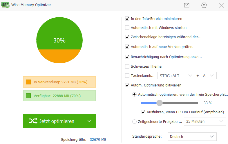 In den Einstellungen von Wise Memory Optimizer können Sie unter anderem die automatische Optimierung aktivieren. Über den Schieberegler legen Sie dort fest, ab welcher Auslastung eine automatische Bereinigung des Arbeitsspeichers durchgeführt werden soll (beispielsweise, wenn weniger als 33 Prozent des Arbeitsspeichers verfügbar sind).