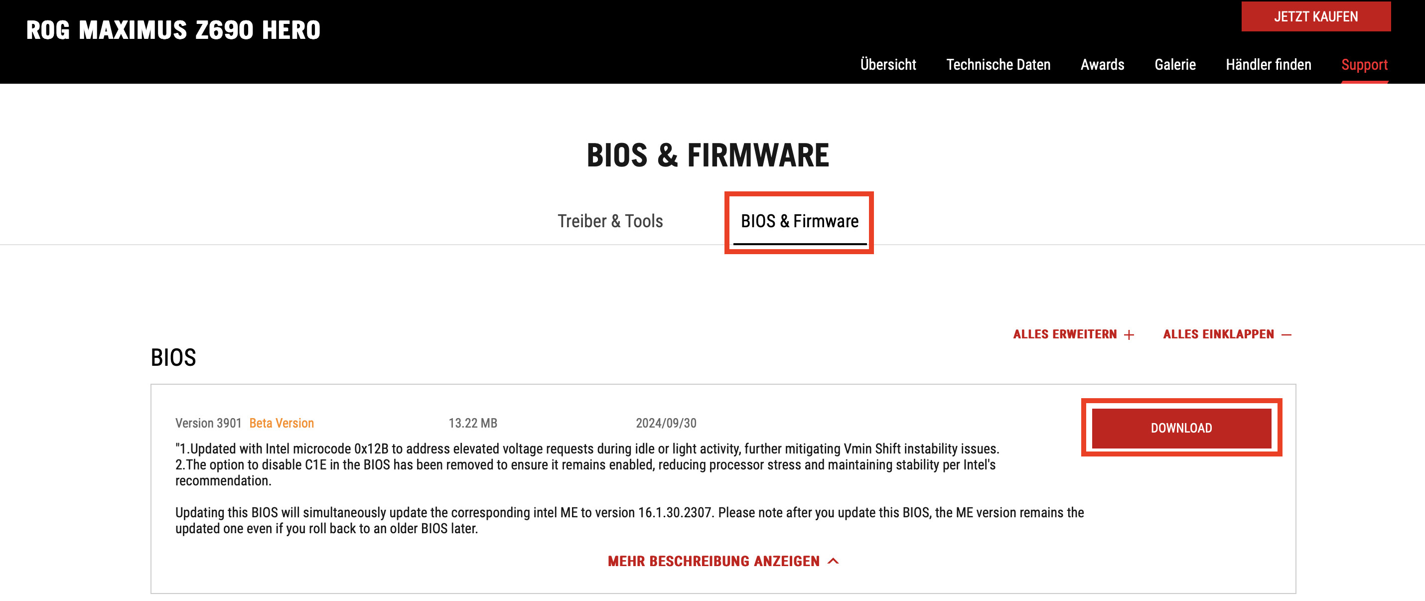 Sie gelangen auf diese Weise zu der Modellseite Ihres Mainboards. Hier können Sie auf „BIOS & Firmware“ klicken und erhalten eine Auflistung aller verfügbaren Updates. Laden Sie die neueste BIOS-Version herunter, indem Sie auf Download klicken. Die Datei ist üblicherweise in einem .ZIP-Format gepackt.