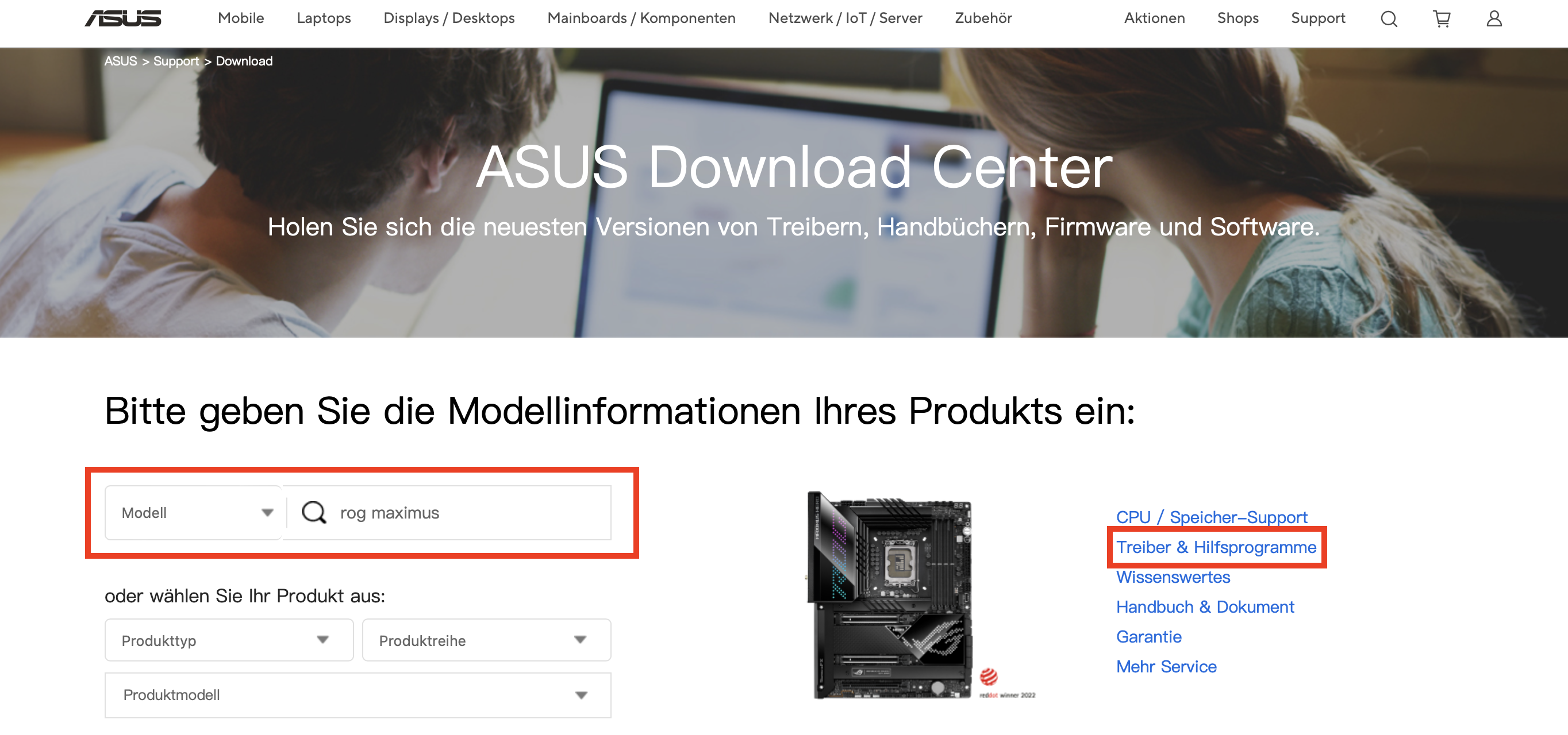 Im nächsten Schritt laden Sie die aktuelle BIOS-Version von der ASUS-Website herunter. Navigieren Sie hierzu auf die offizielle ASUS-Support-Website. Klicken Sie hier auf den Bereich „Treiber & Handbücher“.