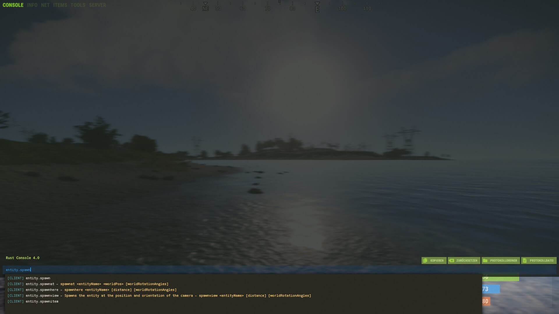 Die Rust-Konsole öffnet sich und Sie können die gewünschten Befehle eingeben (Ausführung mit der Eingabetaste).