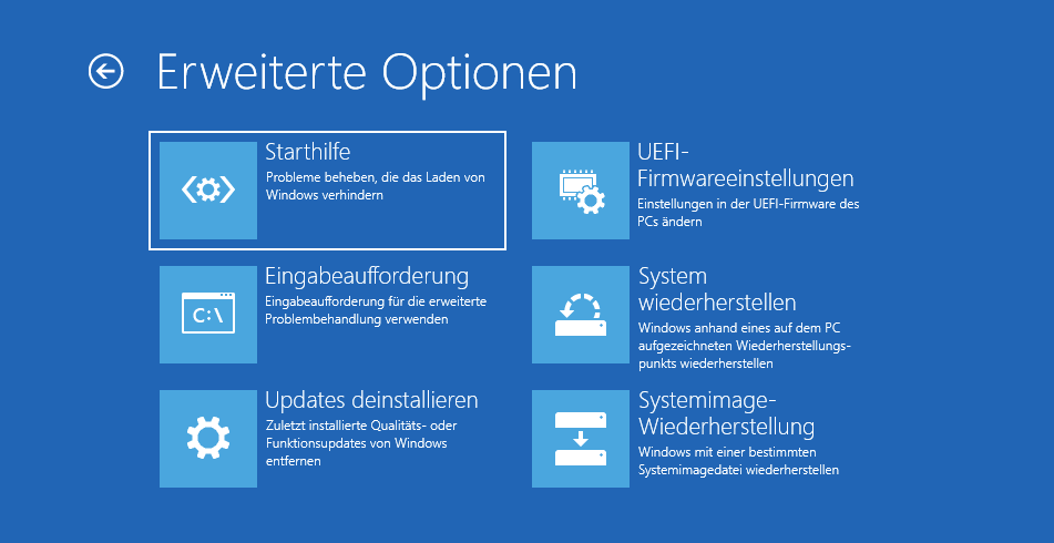 In der Wiederherstellungsumgebung klicken Sie auf „Problembehandlung“ > „Erweiterte Optionen“ > „Starthilfe“. Mit Hilfe dieser Funktion startet Windows eine automatische Fehlerdiagnose und versucht das Startproblem zu beheben.