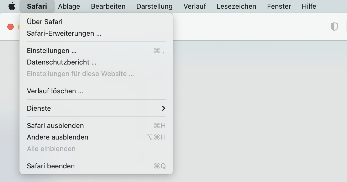 - Ganz oben in der Menüleiste befindet sich rechts neben dem Apfel-Symbol die Option „Safari“. Klicken Sie darauf, um das Drop-down-Menü zu öffnen.
