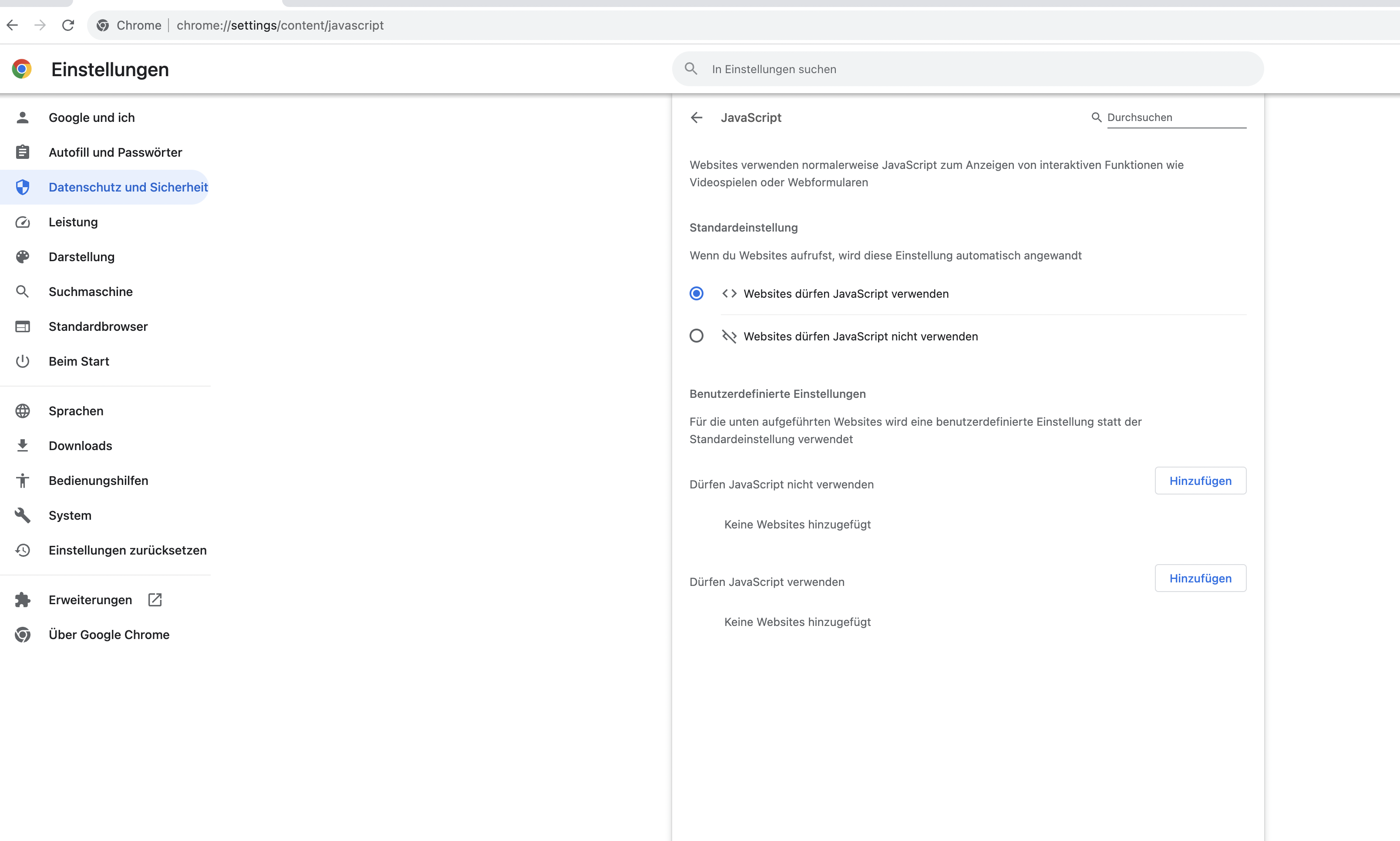 - Dort finden Sie die Option „Websites dürfen JavaScript verwenden“. Wenn Sie JavaScript aktivieren möchten, wählen Sie den Punkt links daneben an. Für eine Deaktivierung entfernen Sie den Punkt.