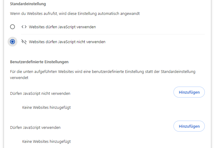 Schritt 4: JavaScript ist bei Chrome automatisch zugelassen. Möchten Sie JavaScript für alle Websites deaktivieren, wählen Sie die Option „Websites dürfen JavaScript nicht verwenden“ aus. Alternativ haben Sie in den benutzerdefinierten Einstellungen die Möglichkeit, JavaScript nur für ausgewählte Websites zu deaktivieren oder zuzulassen.