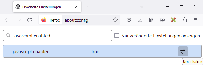Um die Skripte später wieder zuzulassen und JavaScript in Firefox zu aktivieren, klicken Sie beim aufgezeigten Konfigurationseintrag erneut auf „Umschalten“.