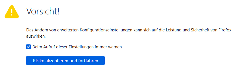 Um die Sicherheitswarnung bei künftigen Aufrufen des Konfigurationseditors nicht mehr zu erhalten, entfernen Sie einfach das Häkchen in der Checkbox „Beim Aufruf dieser Einstellungen immer warnen“.