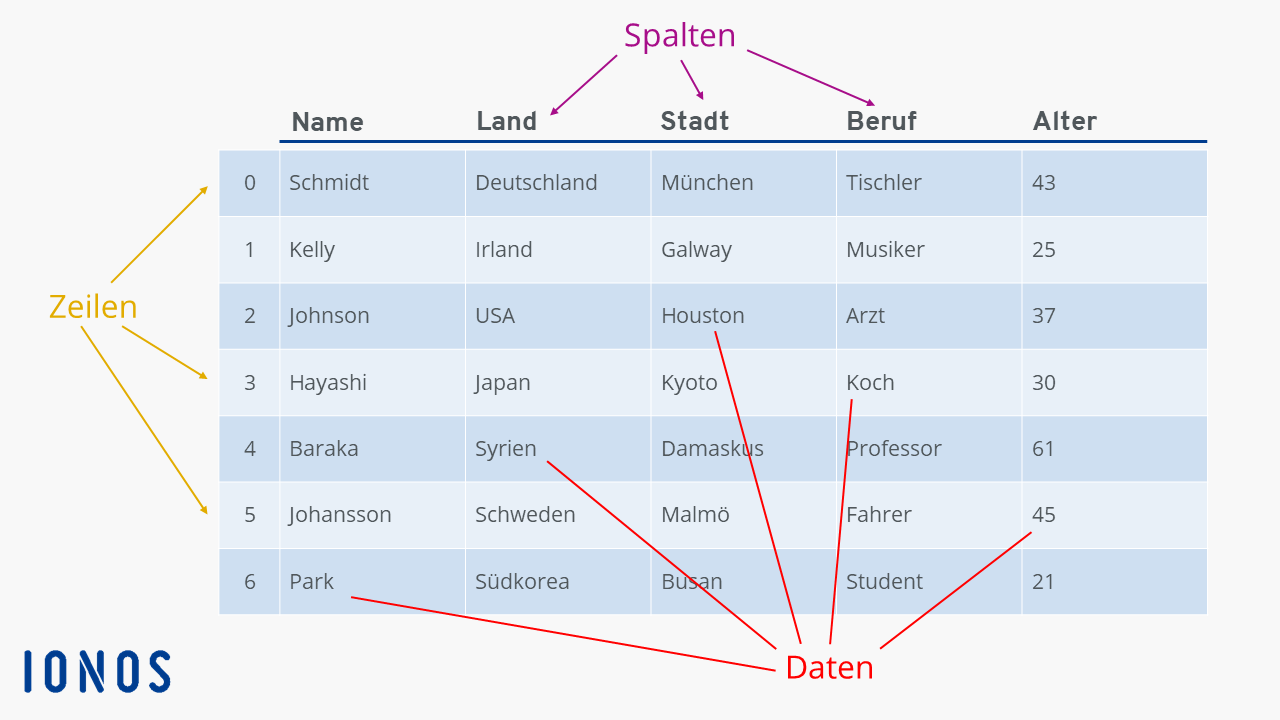 Ein DataFrame besteht aus drei Hauptkomponenten: den Daten selbst, den Zeilenindizes und den Spaltennamen. Der Zeilenindex (oder einfach Index) dient als eindeutiger Bezeichner für jede Zeile. Standardmäßig werden Zeilen mit numerischen Werten indexiert, allerdings können diese durch Strings ersetzt werden. Beachten Sie, dass Pandas DataFrames null-indexiert sind, also dass die Indizes bei 0 anfangen.