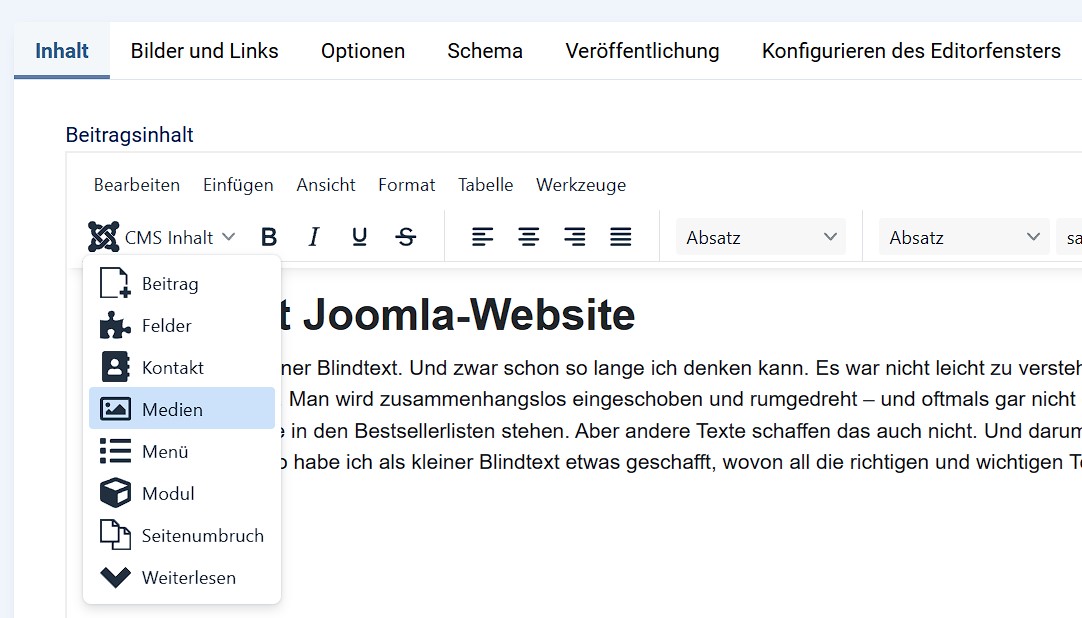 Natürlich sollten Sie auch Bilder in Ihr Webprojekt integrieren, denn selbst der interessanteste Inhalt zieht ohne optische Auflockerung kaum Leserinnen und Leser an. Um einen Beitrag mit Fotos und Grafiken aufzuwerten, müssen Sie diesen lediglich über das Beiträge-Menü öffnen und wählen dann im Editor „CMS Inhalt“ und „Medien“: