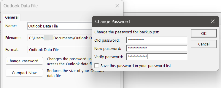 How to change your password for an Outlook data file