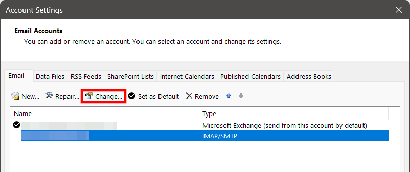 - Select the desired email account and click “Change…”.