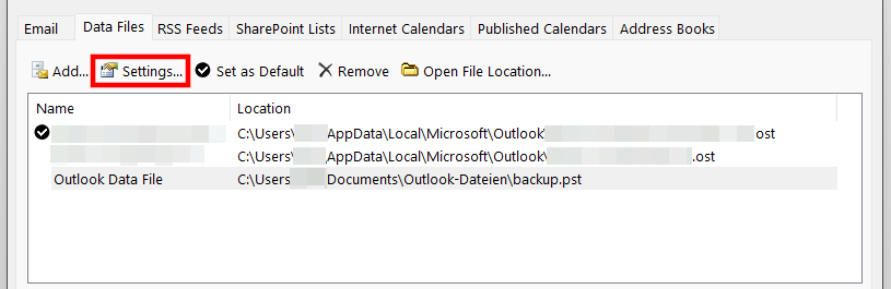 In the Mail Setup window, select the “Data Files” option. A menu will appear listing all currently available Outlook data files. Click on the desired PST file, then click the “Settings…” button.