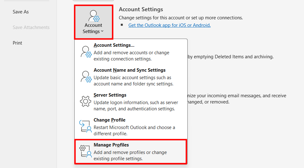 If you’ve changed the password for your email account (e.g., Hotmail, Gmail, etc.) and want this change to take effect in your Outlook client, you’ll need to update your account settings in Outlook. To do this, start by opening the “File” tab. Then, under Account Information, click on “Account Settings”. In the pop-up menu, select “Manage Profiles”: