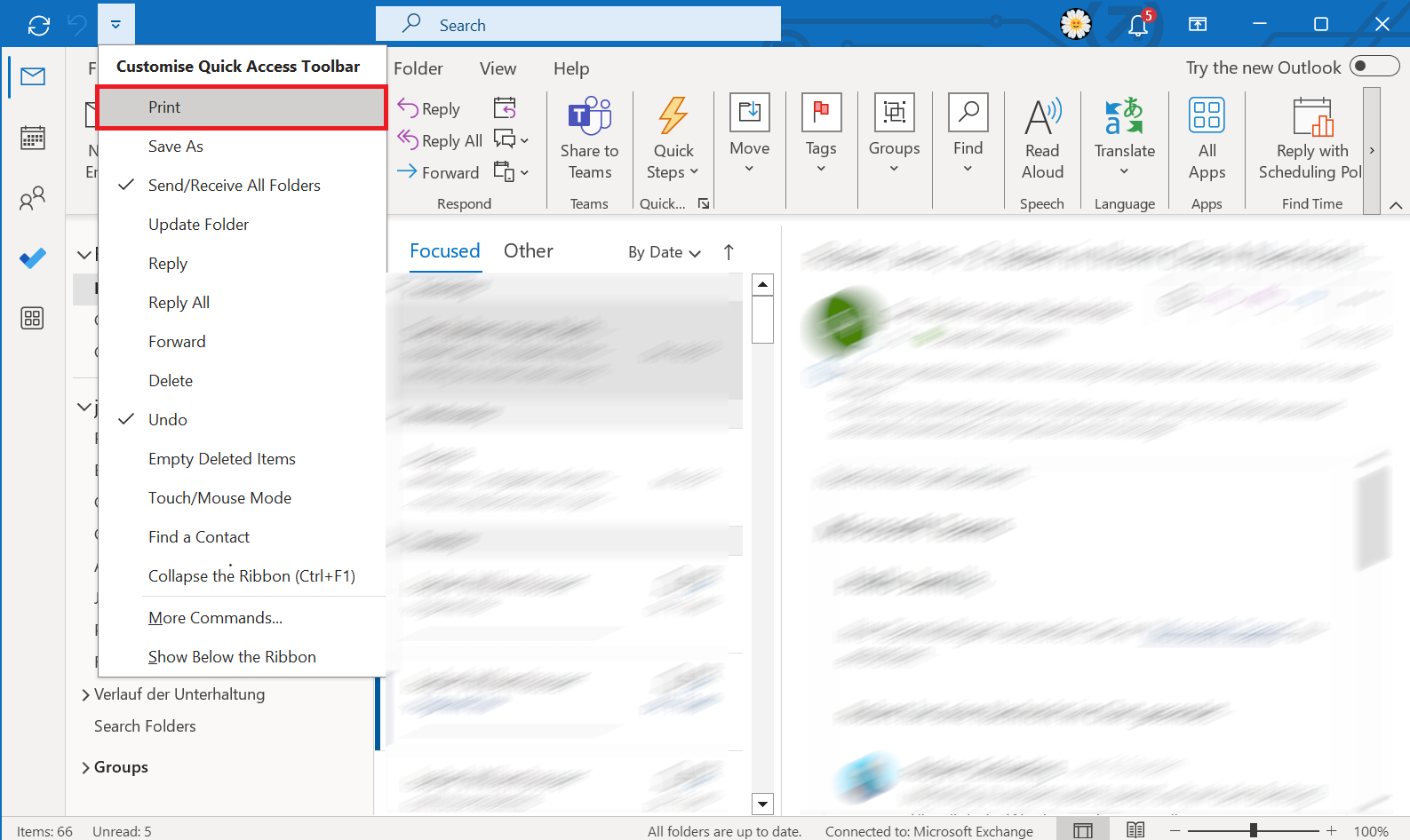 If you frequently print emails in Outlook, you should consider customizing the blue toolbar or the ribbon at the top of Outlook.
