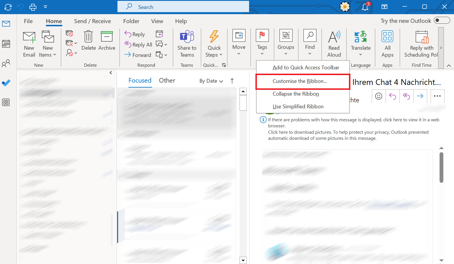 Step 1: Click on the ribbon with the right side of your mouse. A selection menu will appear with the option Customize the Ribbon…. Click on this option.