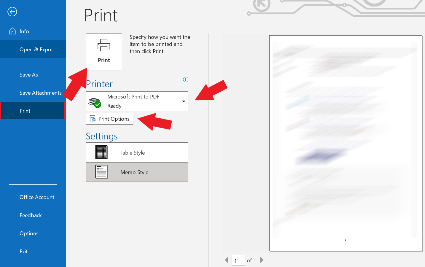 Step 2: When you click on File in the top left-hand corner, you’ll be taken to the Account Information window for the current Outlook account. Click on Print in the left sidebar. A new window will now open, and a print preview will be displayed on the right side of the screen.