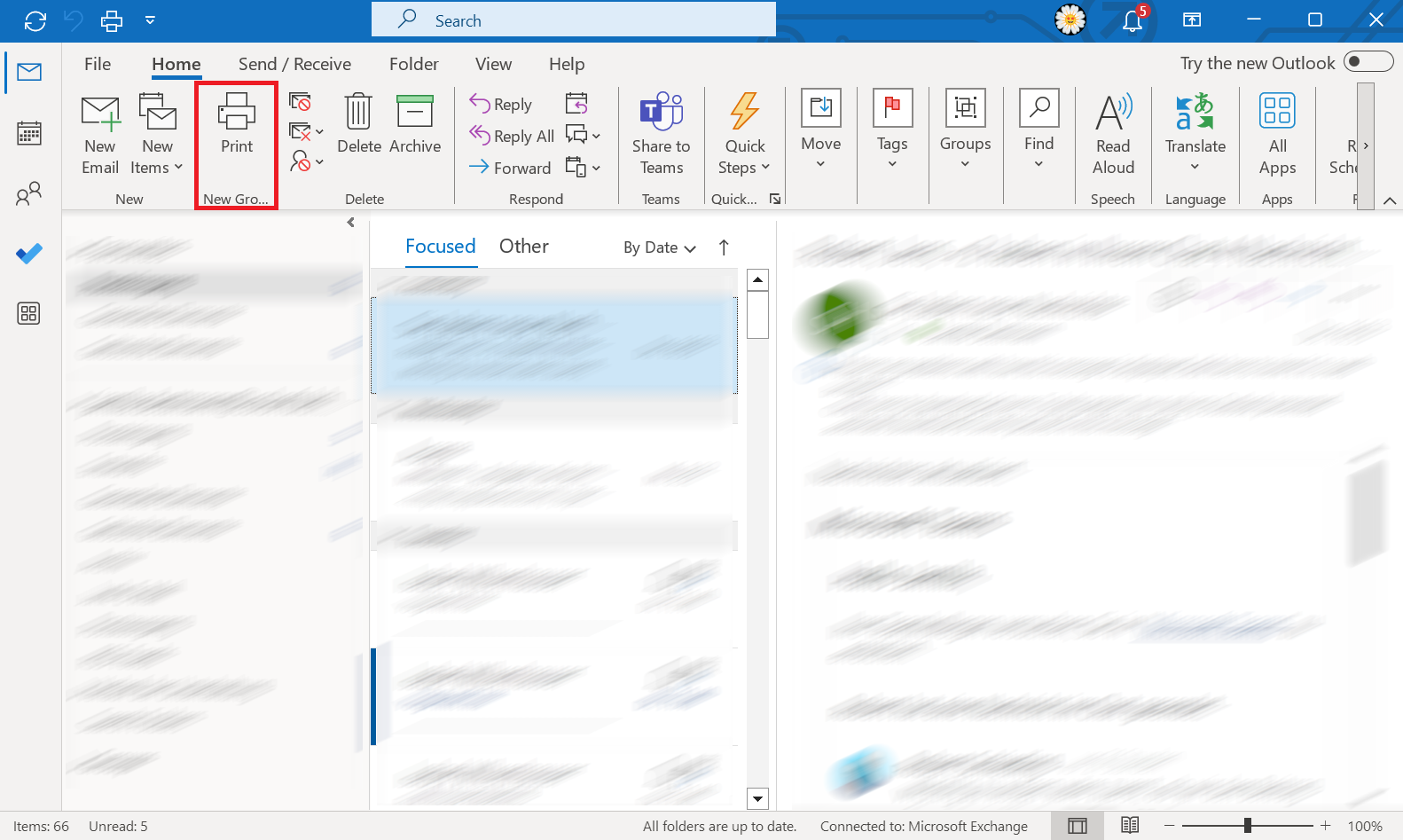 In the new version of Microsoft Outlook, printing emails is easier than ever. Once you’ve selected the email you would like to print, click on the printer icon in the top right corner of the ribbon. The print preview will now open in a new window. Clicking on Print takes you to the print settings where you can print your email as you normally would.